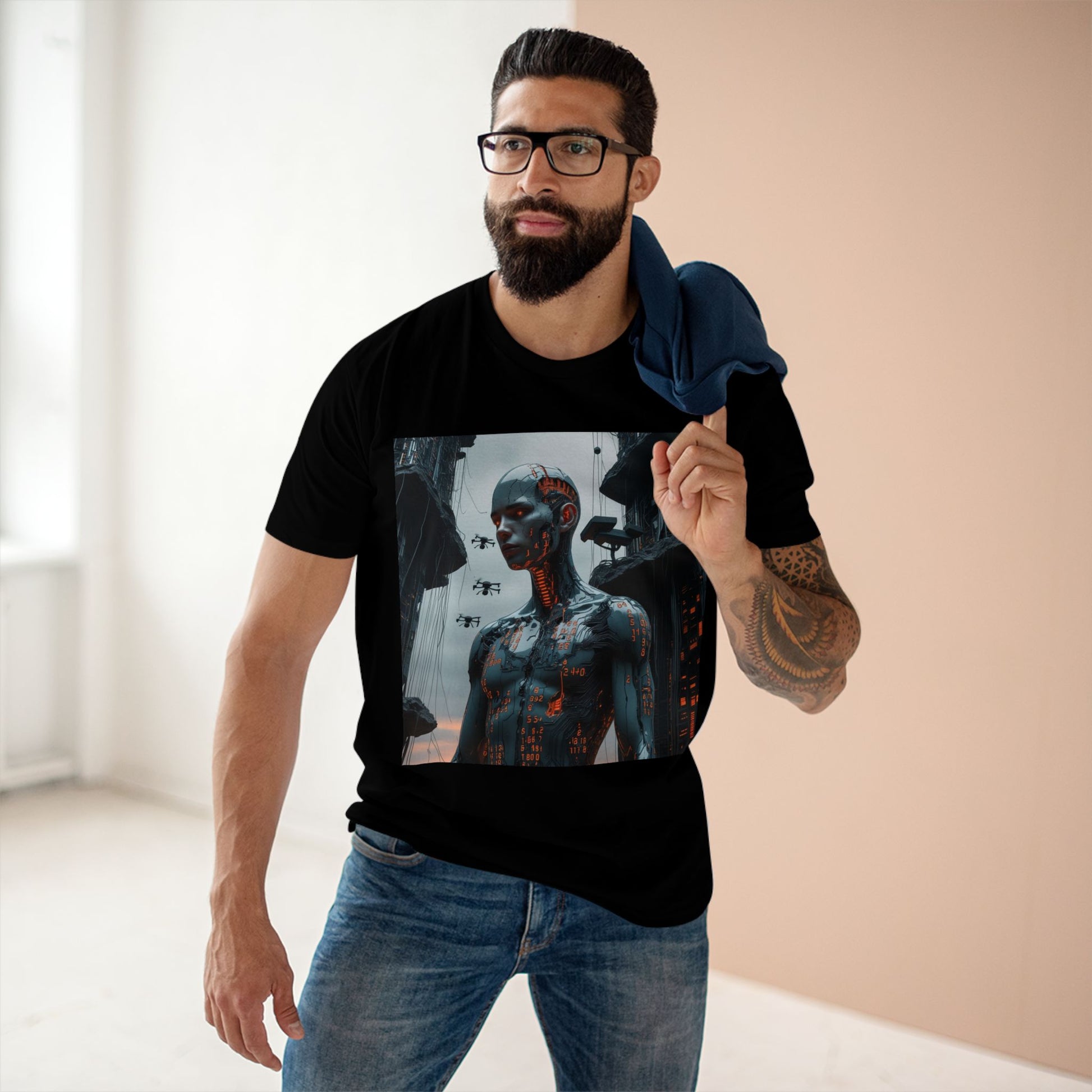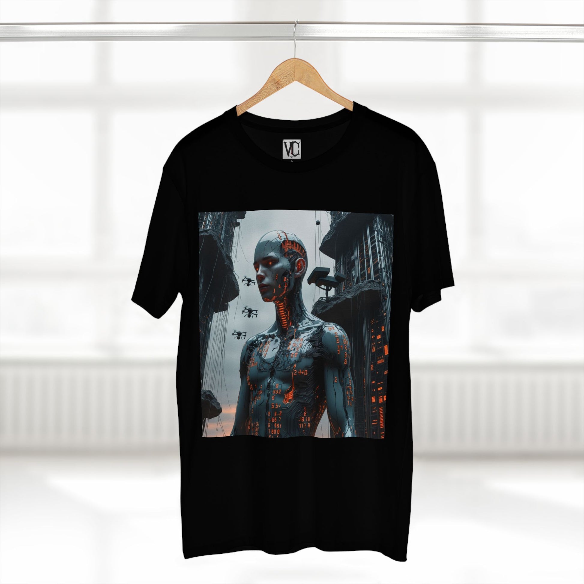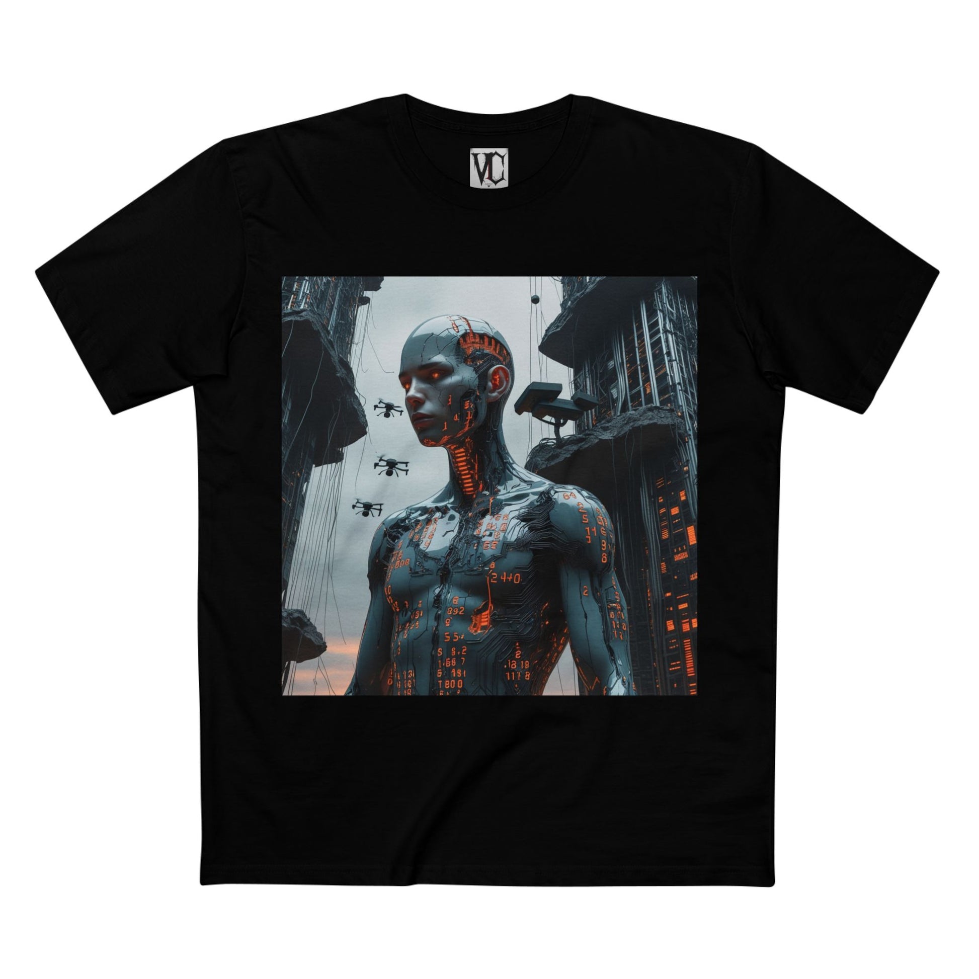 A dystopian vision of humanity merged with technology, this design features a humanoid figure with semi-transparent skin, revealing glitching circuitry and numbers bleeding through their veins. They stand amid a collapsed data tower, with hanging wires resembling veins and surveillance drones patrolling the sky. Rendered in dark chrome and orange tones with high-detail, brutalist backgrounds, this graphic embodies bio-hacked identity, system corruption, and cyberpunk decay — perfect for alt-cyber streetwear.