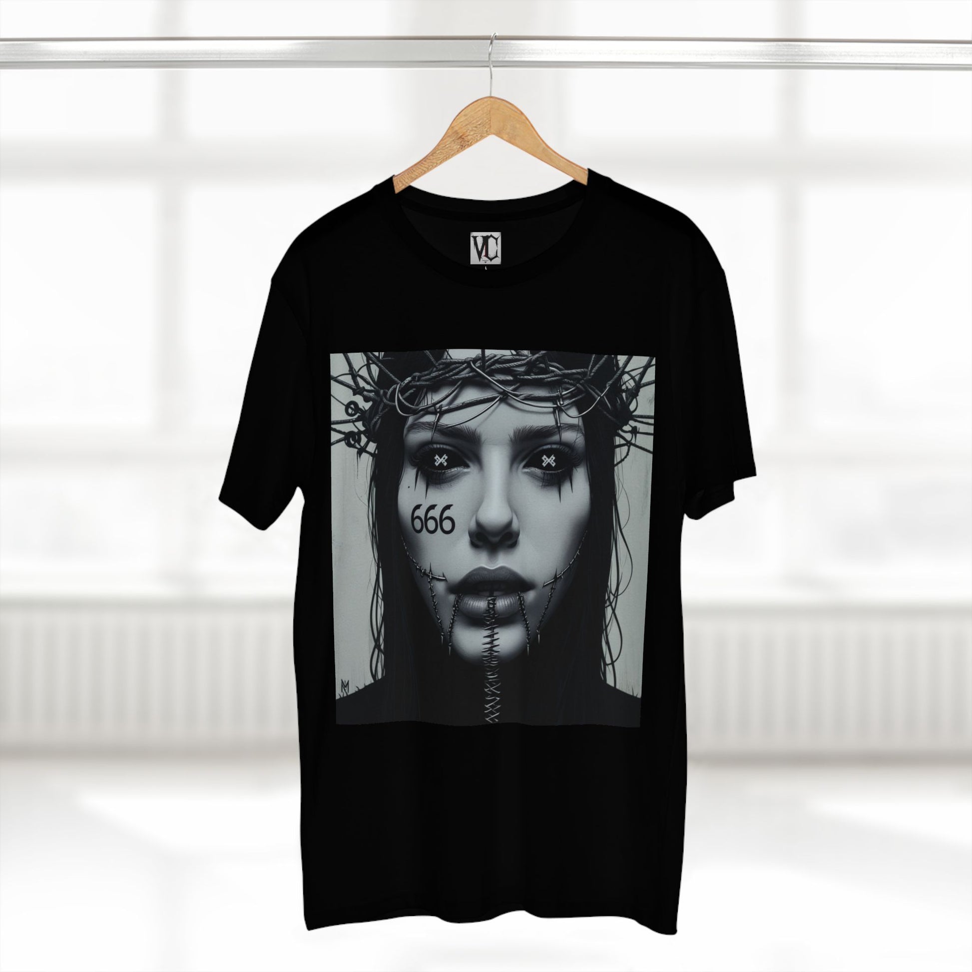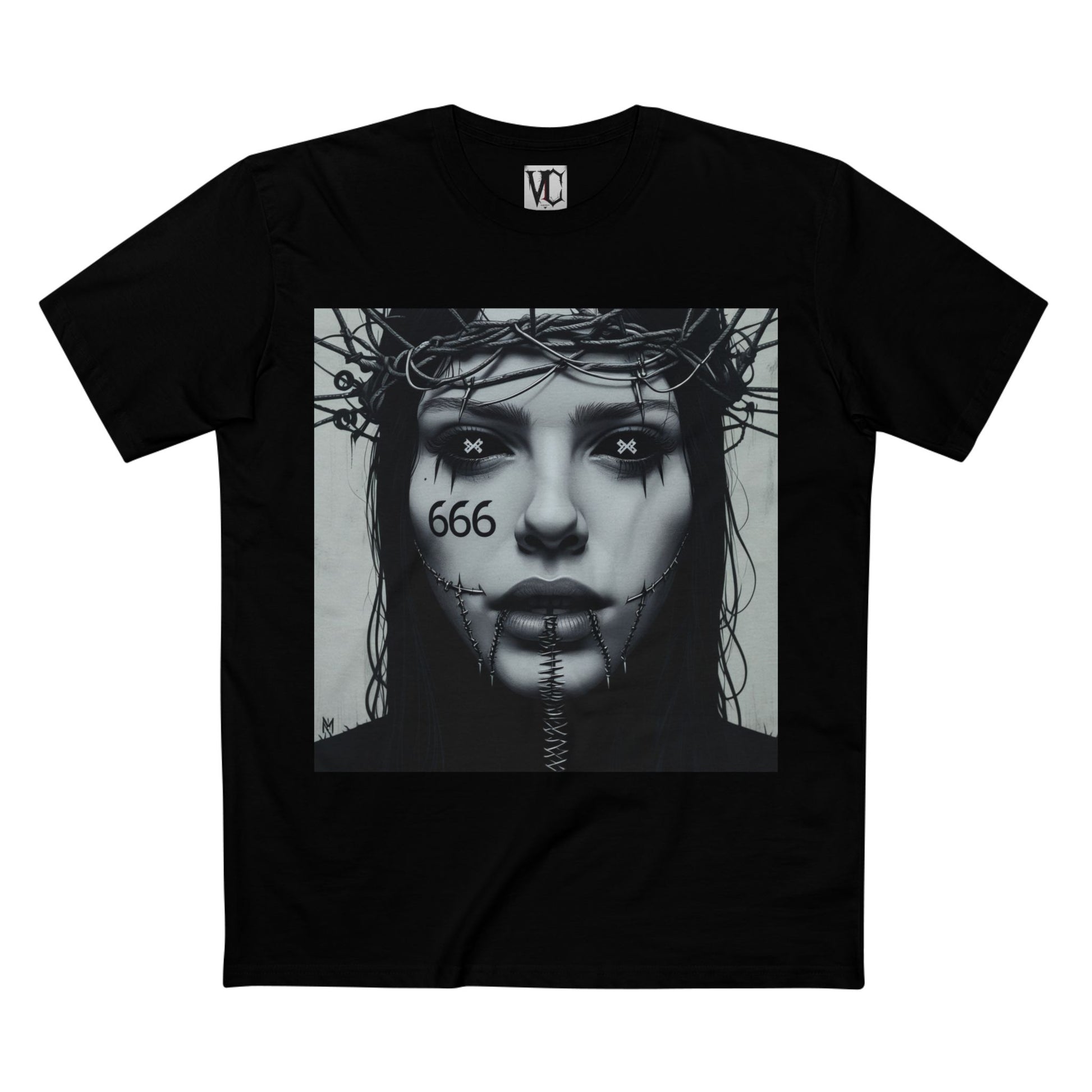 A haunting portrait of defiance and resignation, this minimalist brutalist design features a stitched-shut mouth and black, empty eyes. A crown of wires and nails rests atop the head, while subtle upside-down crosses appear in the pupils, and a 666 tattoo is inked beneath dead eyes. Rendered in moody, portrait-focused detail, this design conveys muted rebellion and dark, ritualistic intensity.