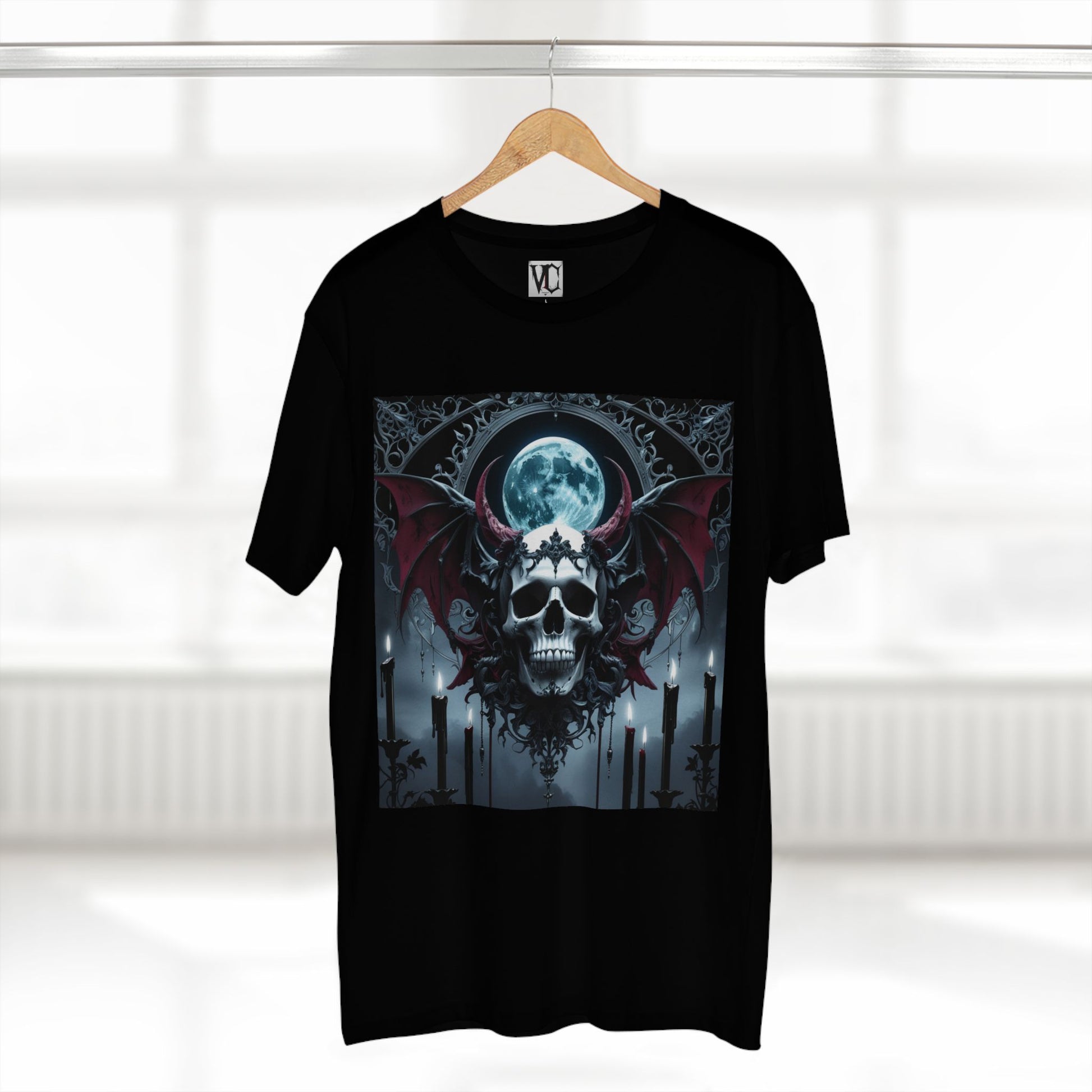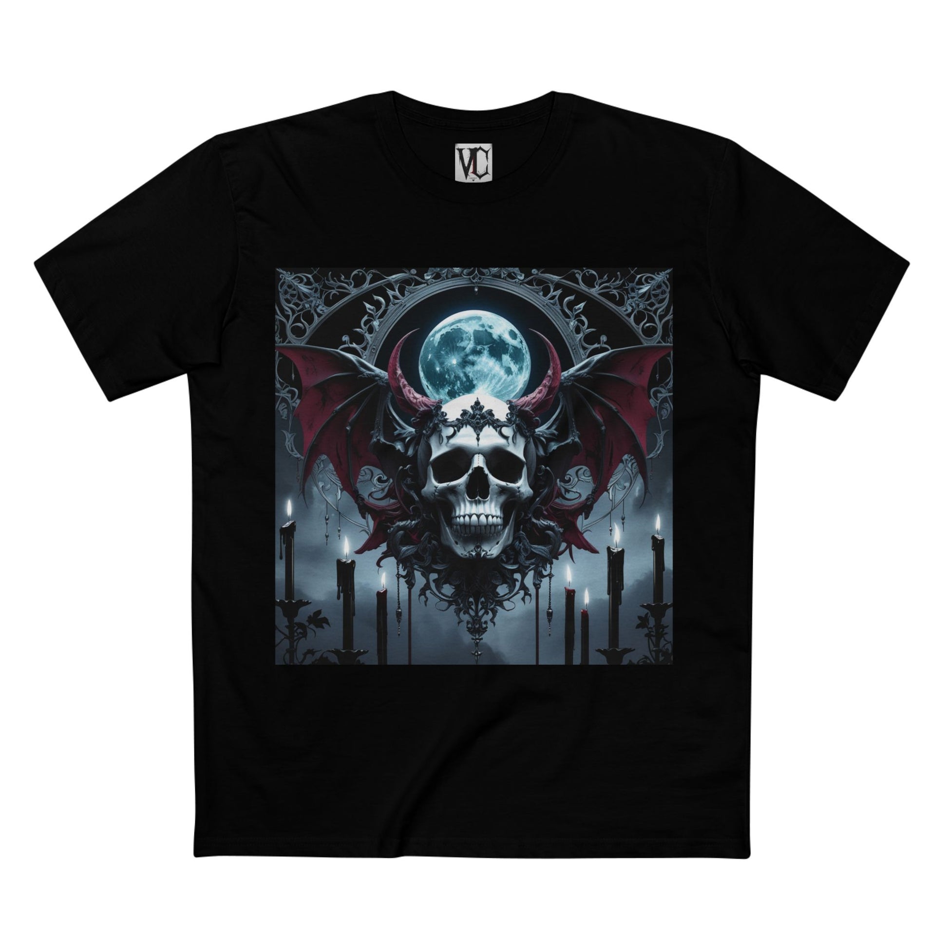 This tee wears like midnight brought to fabric. An ornate skull sits at the center, wrapped in crescent moons and demonic wings, while baroque flourishes and stained-glass motifs creep outward in deep blacks, crimson, silver, and ghostly blue. Dripping black candles and ethereal shadows add a slow, decaying elegance — the whole piece feels like a page torn from a Victorian grimoire. It’s a shirt for nights when you want to walk under fog-lit streets, linger in candlelit rooms, or layer up for shows and gatherings where mood matters more than noise. The medium-weight cotton holds the print’s fine details, so the intricate linework and subtle color shifts read clearly up close and from across the room. Wear it with ripped denim, leather, or under a long coat; it carries an atmosphere of quiet menace and fragile beauty that stays with you through the evening.