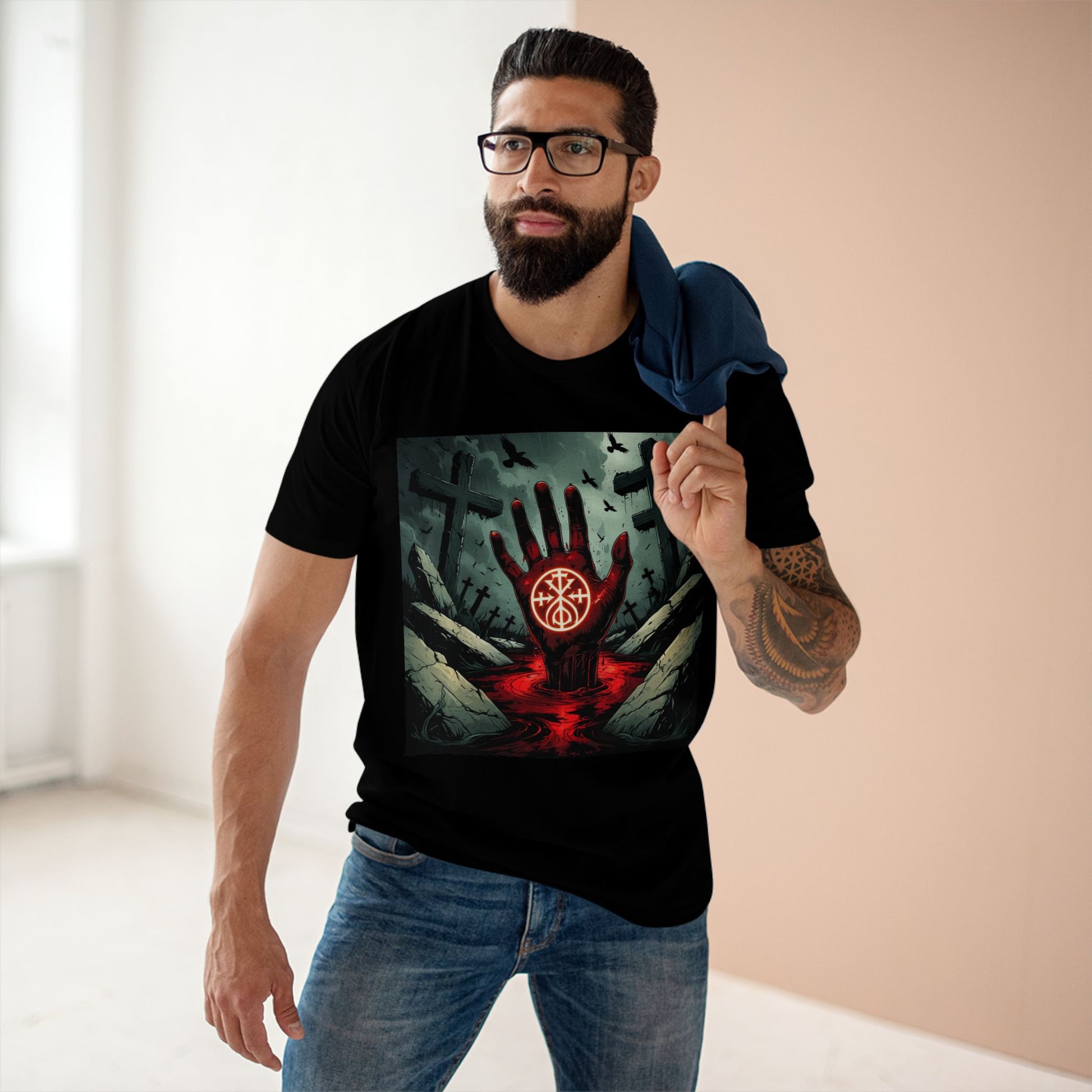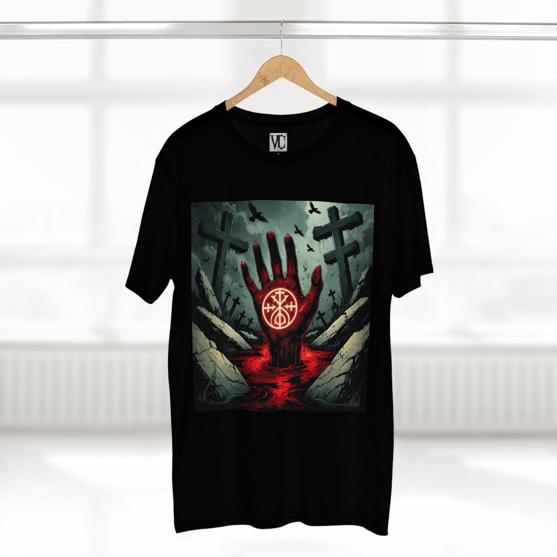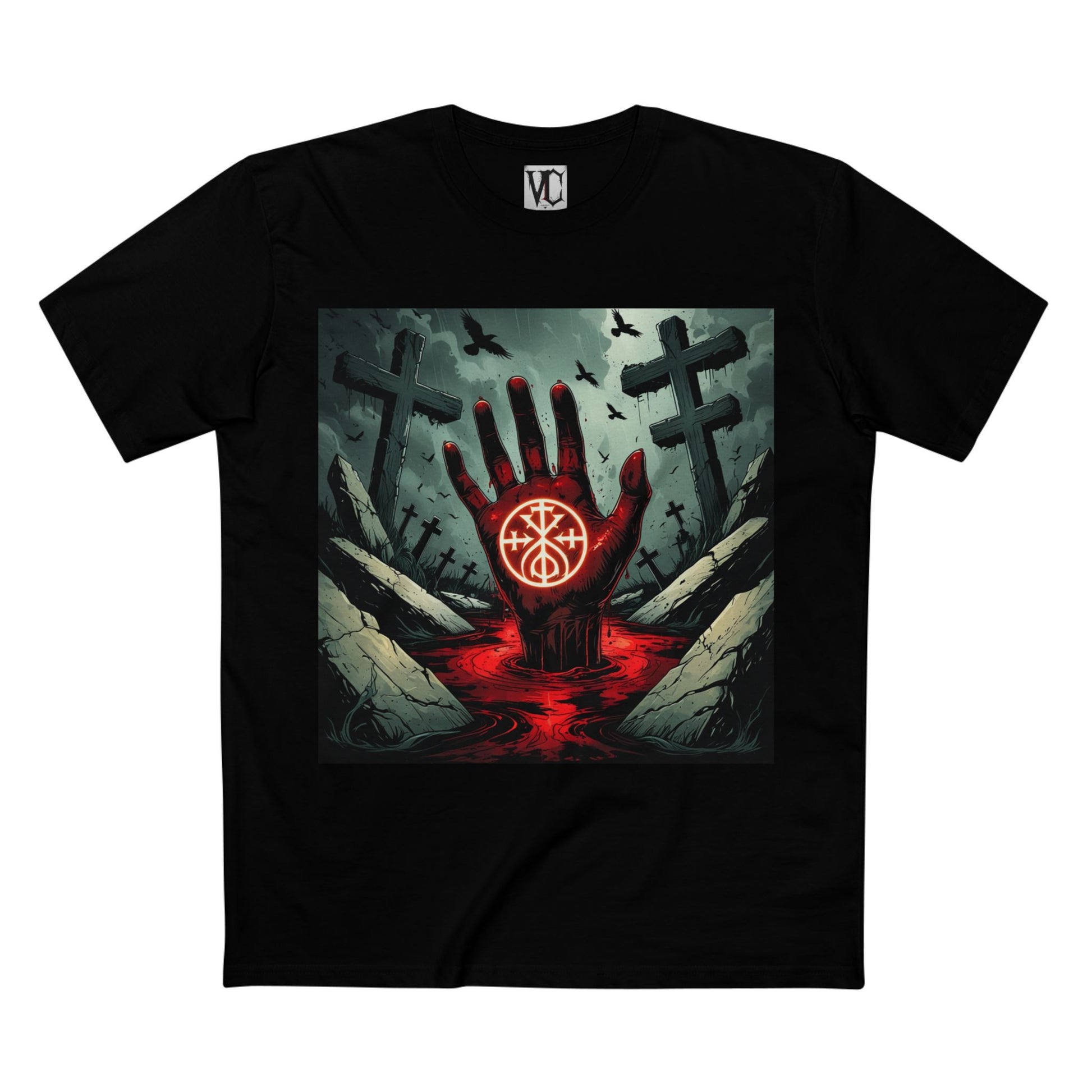 A dark, horror-inspired streetwear graphic featuring a decaying hand reaching out from a pool of ink or blood, its palm branded with a glowing sigil. Inverted crosses are etched into broken stone around the hand, while stormy skies and crows fly overhead. Rendered in distressed textures with blood red, black, weathered bone, smoke grey, and green tones, this design captures occult horror, ritualistic symbolism, and grunge-inspired aesthetic perfect for alternative streetwear.