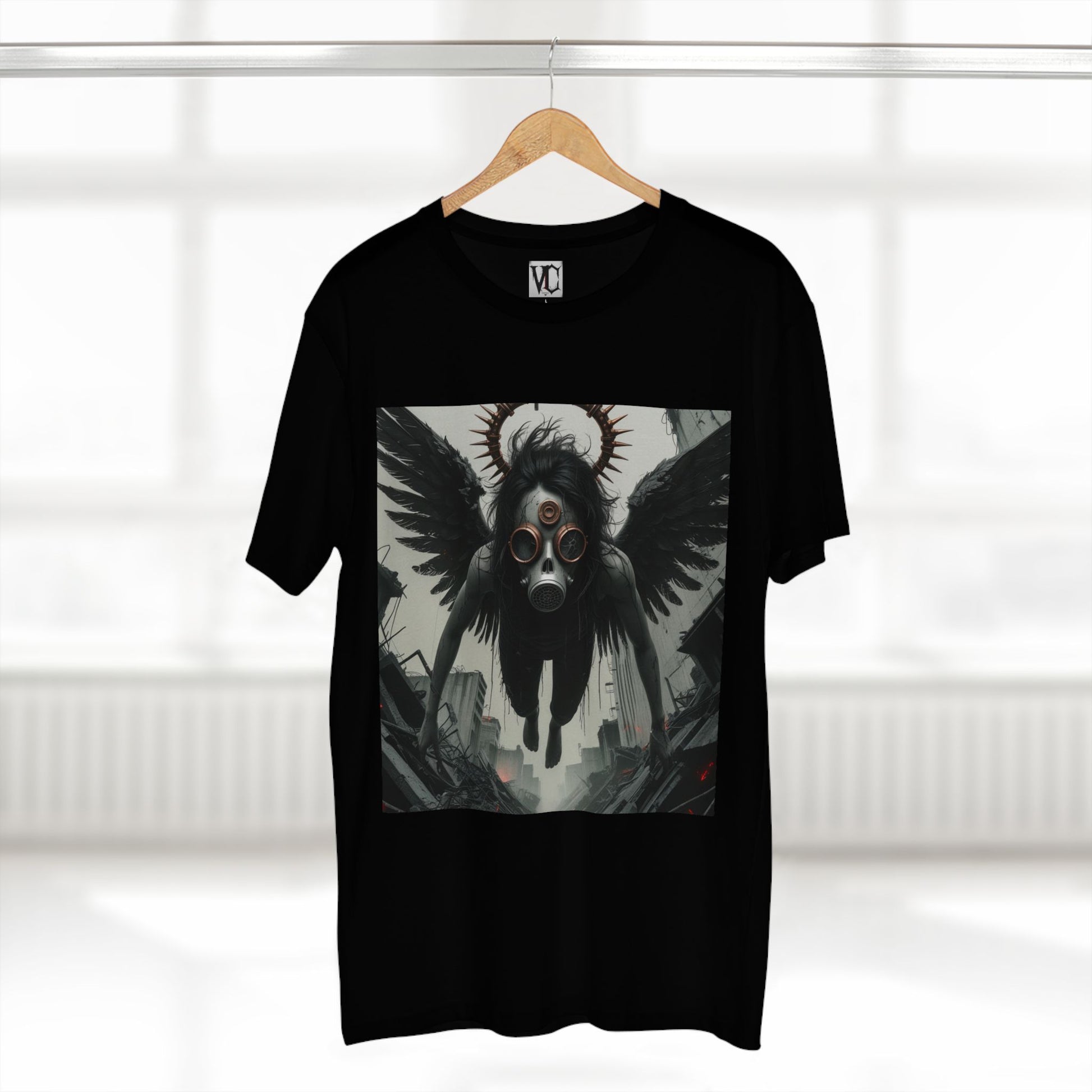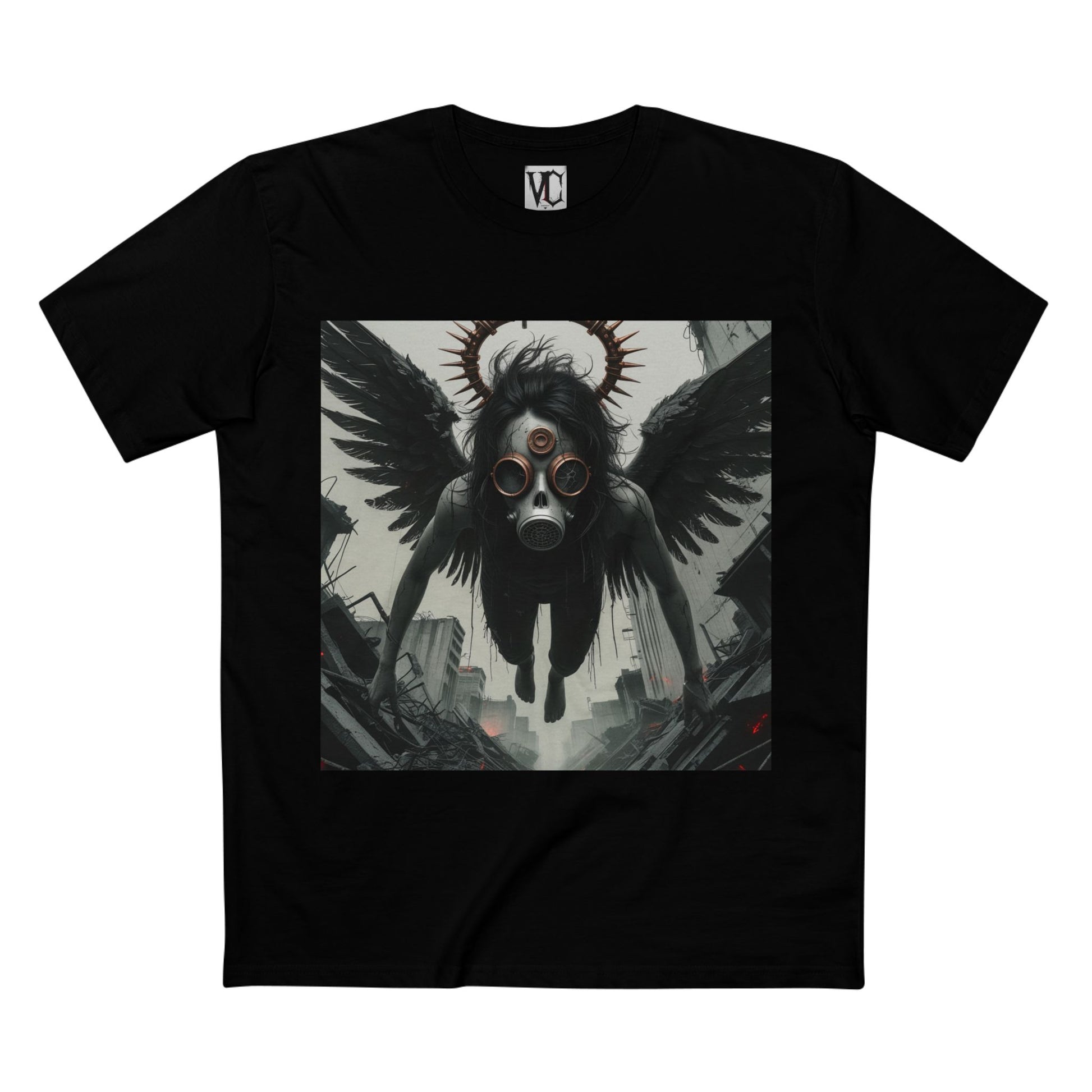 This tee carries the hush of a ruined city and the weight of a fallen guardian. A tattered-winged angel floats over concrete skeletons, wearing an industrial gas mask and a spiked halo—gritty, haunted, and strangely reverent. The greyscale palette with thin veins of red gives the image a cinematic, late-night glow. Wear it to signal quiet rebellion: pairing well with layered streetwear, leather, or a worn denim jacket. It sits comfortably, drapes cleanly, and lets the artwork take the stage—an emblem for those who like their style dark, thoughtful, and a little dangerous.