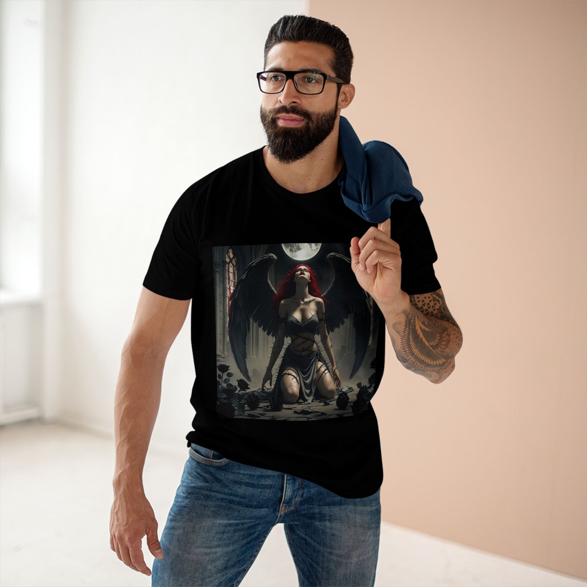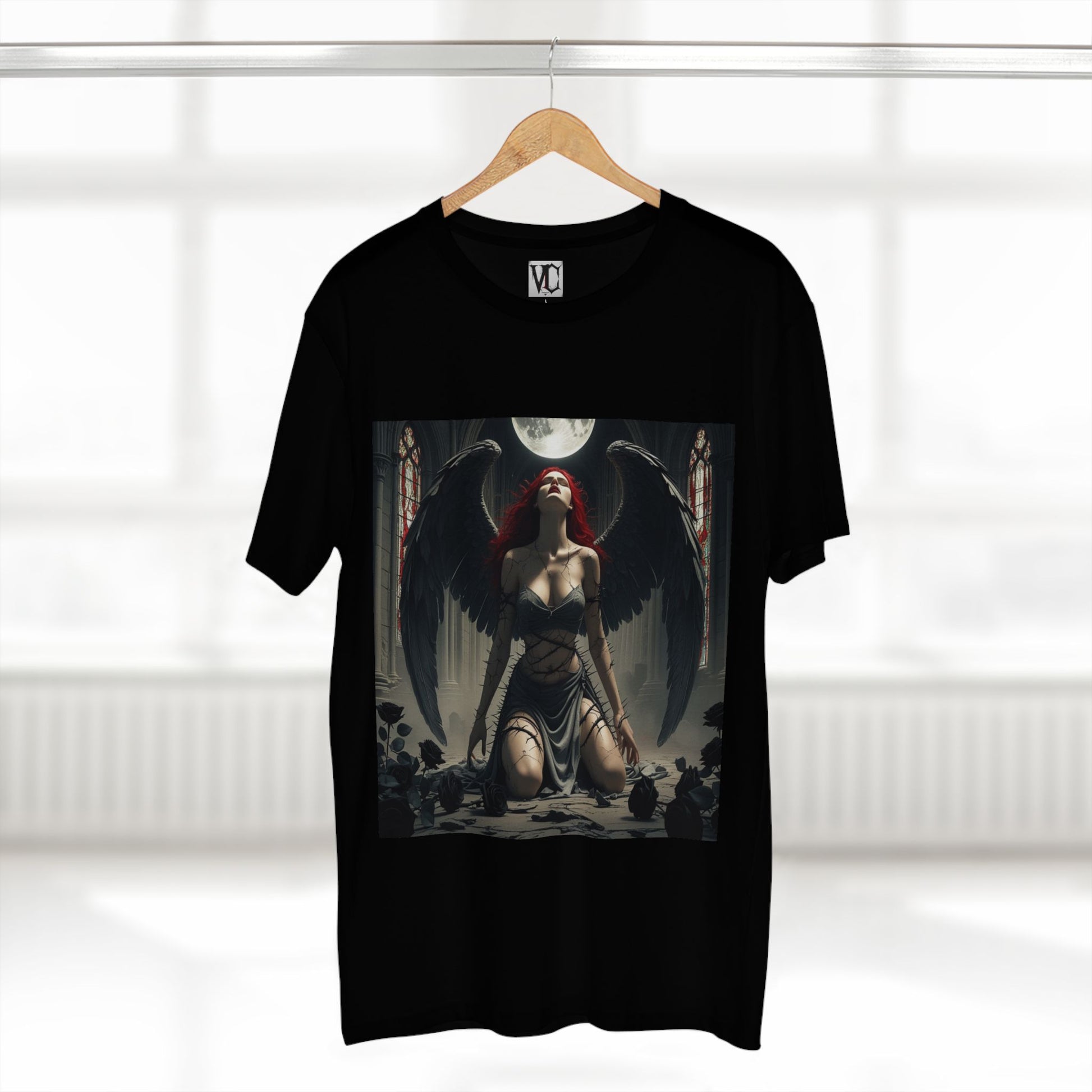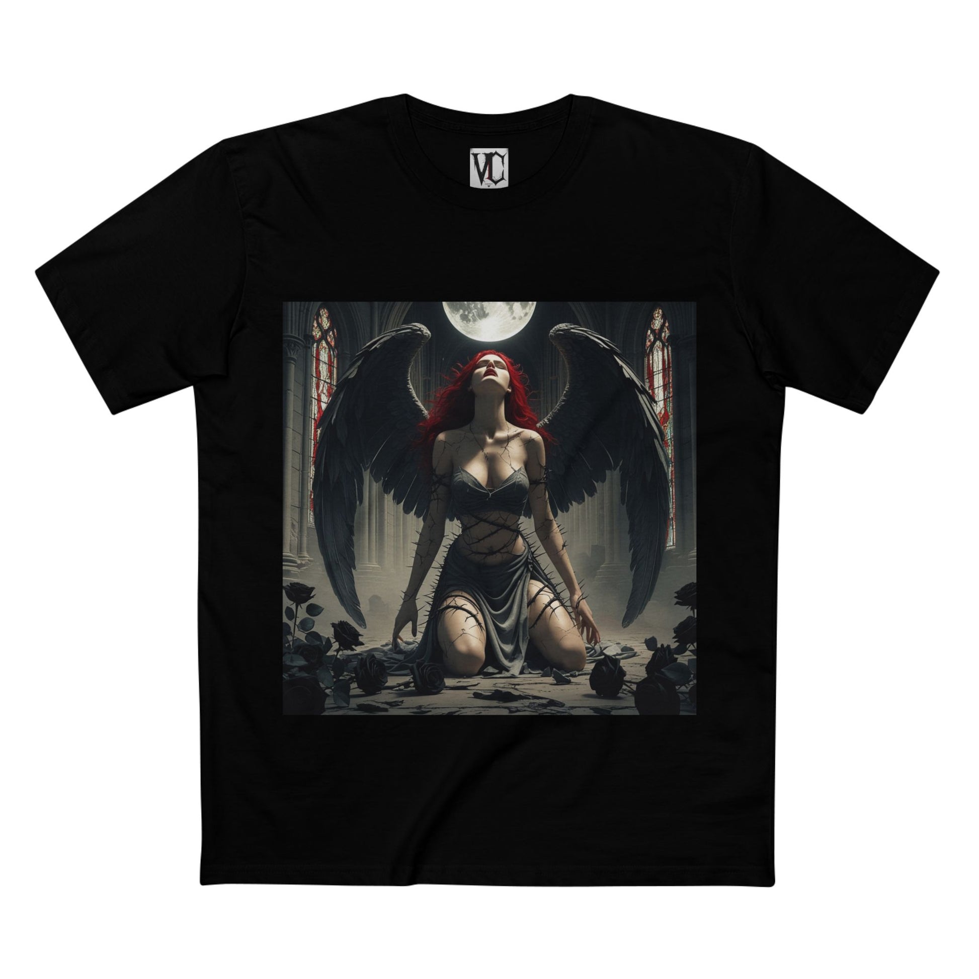 A dark fantasy streetwear graphic featuring a fallen red-haired angel with large, cracked wings kneeling beneath a full moon. Their body is bound in black thorns and draped in tattered fabric, surrounded by gothic cathedral ruins with moonlight streaming through shattered stained glass. Black roses bloom across the cracked ground, creating an atmosphere of baroque decay and tragic beauty. Rendered in ultra-detailed, print-ready style with black, ivory, blood red, and faded silver tones, this design is perfect for gothic and darkwear fashion.