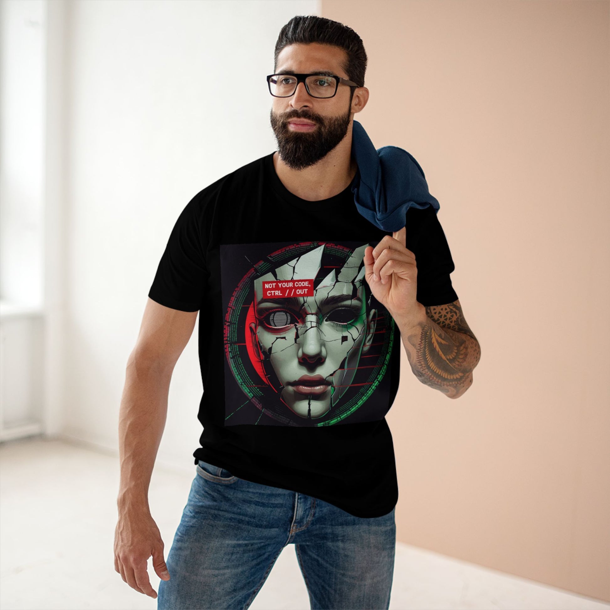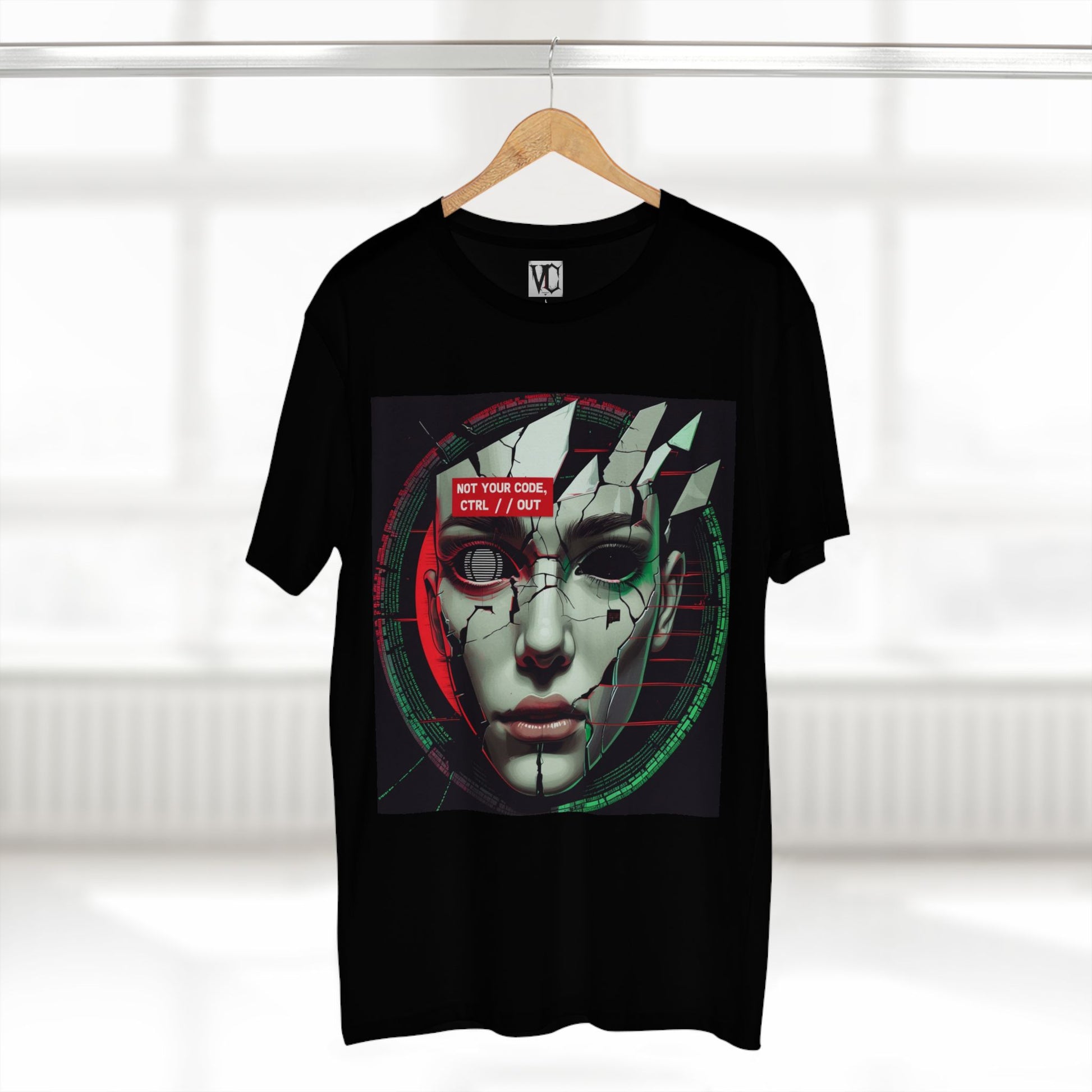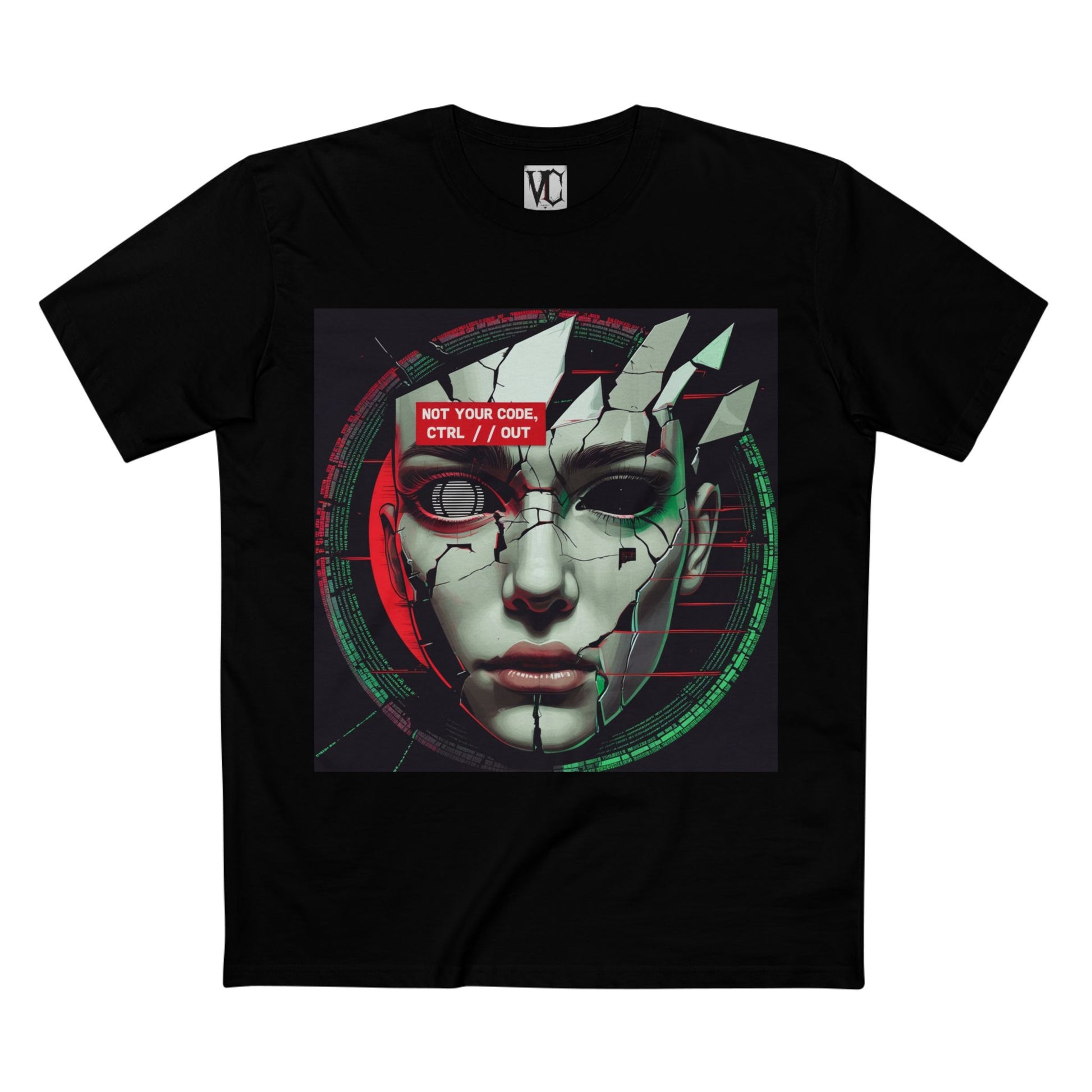 A bold, cyberpunk tee that feels like a fragment of a neon city slipped into your wardrobe. The front holds a glitching, broken face—half human, half scanner—where a barcode replaces an eye and text shards declare “NOT YOUR CODE” and “CTRL // OUT.” Shattered mirrors and a halo of redacted data pulse behind the image, all in stark black, glitch red, chrome, static grey, and electric green. Wear it when you want to push back against surveillance and blend streetwise edge with tech-noir style. It sits cleanly on the body, holds its shape, and carries that lived-in, urban rebel energy from show to late-night meetups.