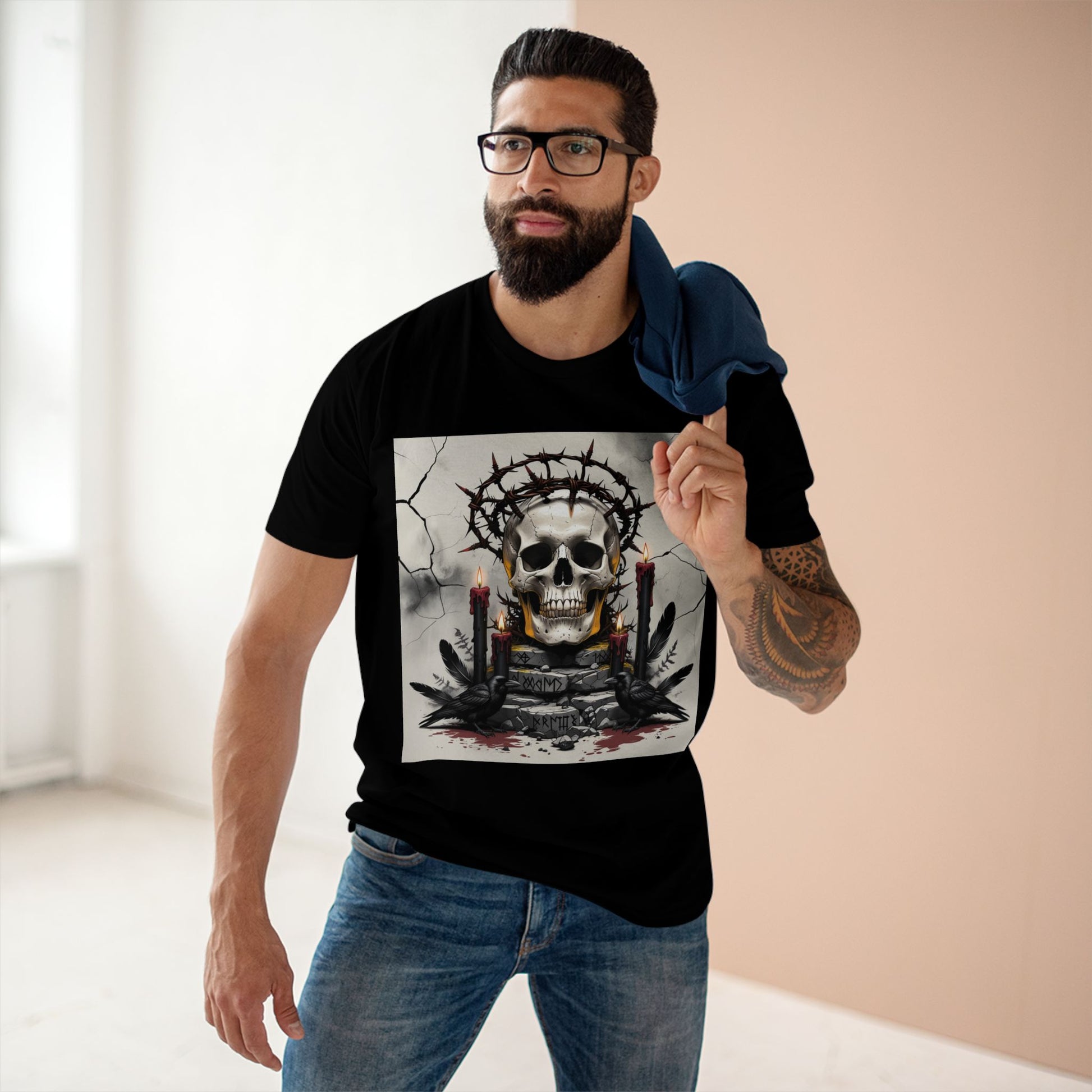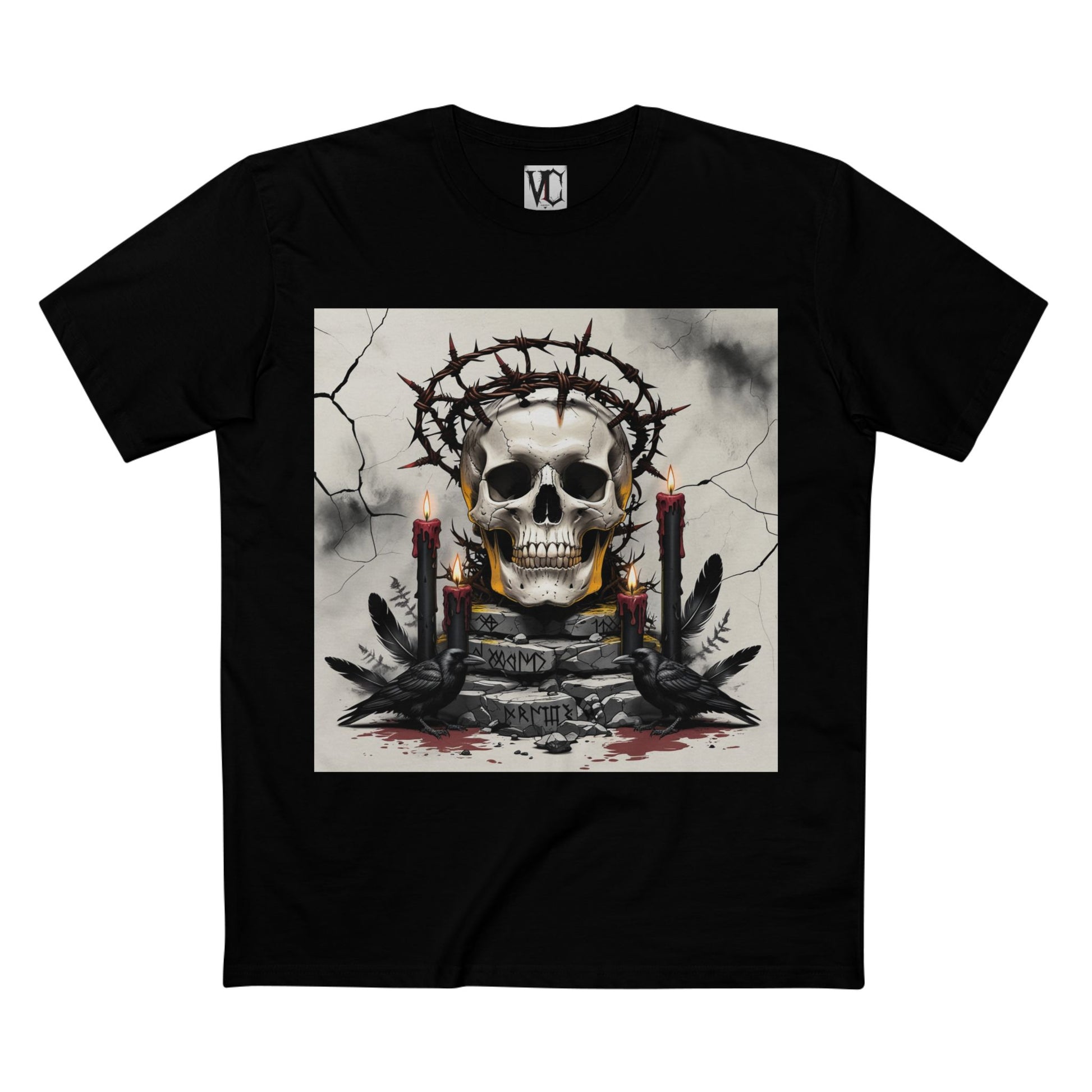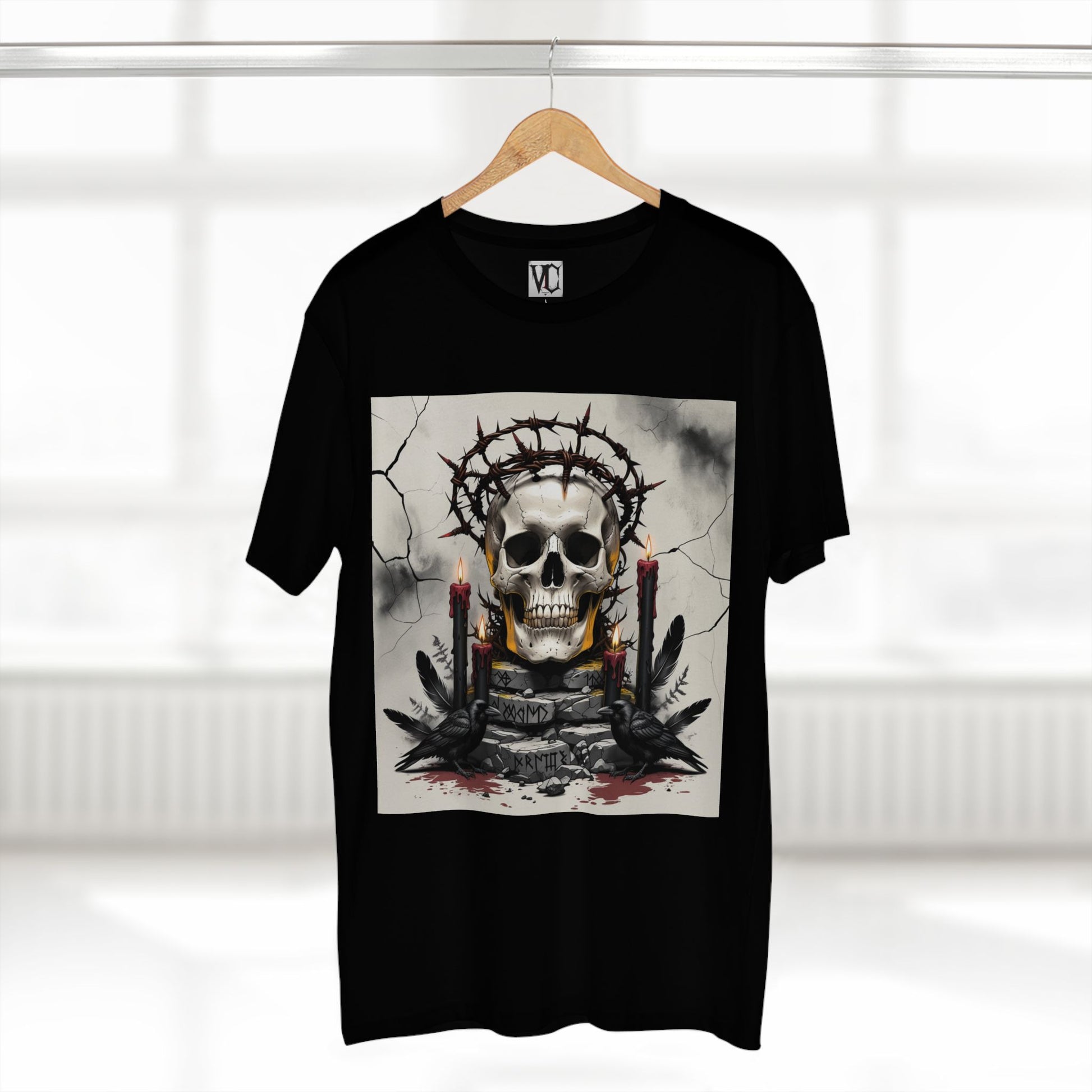 This tee wears like a whispered ritual — quiet until you lean in. A bone-white skull sits crowned in rusted barbed wire, ringed by melting black candles and scattered raven feathers. Cracked marble, runic scars, and drifting smoke thread through the image, giving the shirt a worn, relic-like presence. The muted palette of charcoal, ash grey, and faded crimson keeps the mood somber and refined. It layers easily under a leather jacket or over a long-sleeve for late-night shows, cemetery walks, or underground gatherings. For those who collect darker symbols and subtle storytelling, this shirt reads like a page from a private grimoire: worn-in, thoughtful, and quietly ritualistic.